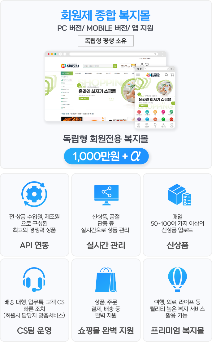 독립형 복지몰을 구축, 분양 후 국민클럽이 사업운영(MD, 디자인, C/S, 정산등)에 대하여 일체의 서비스를 제공합니다.